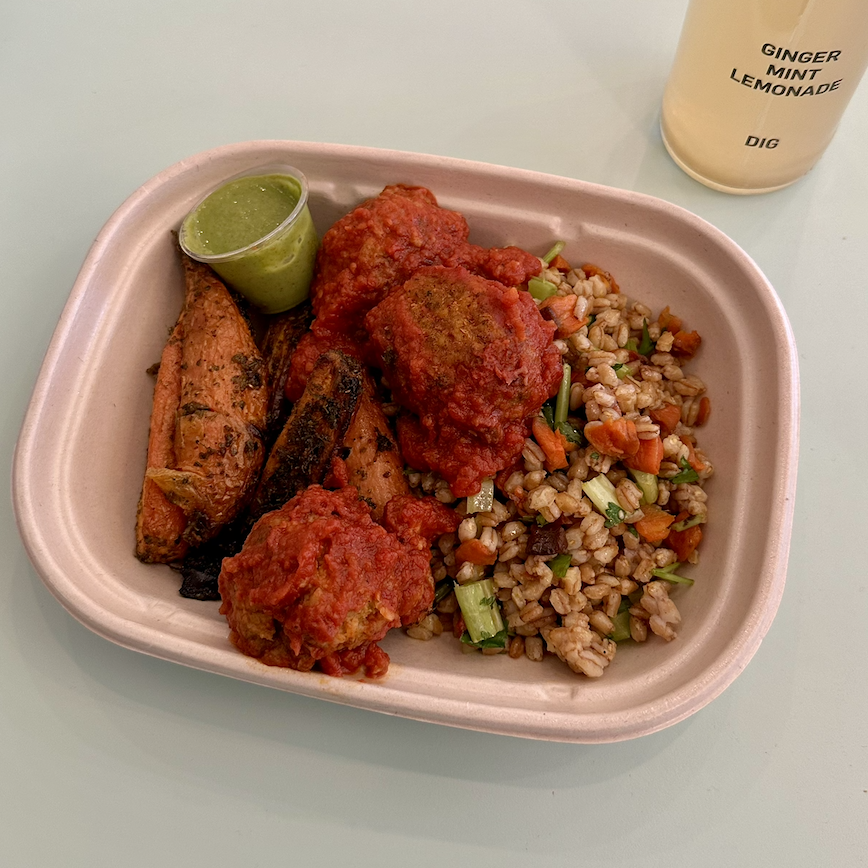 DIG's Meatballs and Ragu is pure Italian-American comfort, the kind of dish that feels like home no matter where you're from. The star of the plate is a blend of beef and chicken meatballs, expertly seasoned and cooked to tender perfection. These hearty meatballs are then lovingly finished in a house-made tomato ragu that's been simmered to develop deep, rich flavors. The sauce clings to each meatball, its bright acidity balanced by the savory meat and aromatic herbs. Whether enjoyed on its own or paired with crusty bread or pasta, this dish embodies the slow-cooked, love-filled meals that make winter bearable—a reminder that the simplest ingredients, when treated with care, create the most memorable comfort.